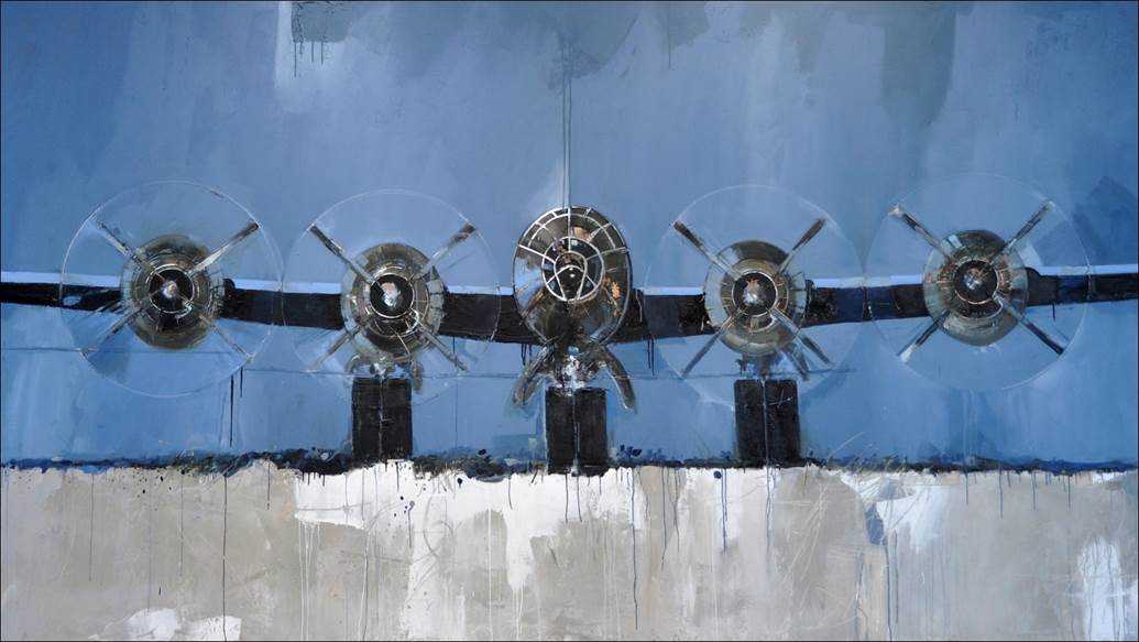 Painting (Titled L’Homme-Oiseau by Jean-Pierre Lafrance) offered by the Government of Québec on the occasion of the 54th Annual General Meeting held in Montreal in June 1998. This painting is displayed in the lobby of IATA’s headquarters in Montreal (Tour de la Bourse). The exact French name of IATA is: Association internationale du transport aérien. The aircraft shown on this picture is a Boeing Superfortress B-29, which is a four-engine propeller-driven heavy bomber designed by Boeing and flown primarily by the United States during World War II and the Korean War.