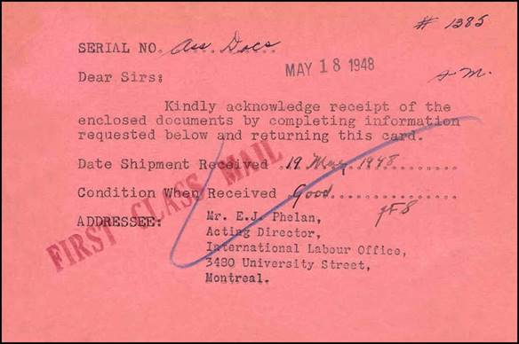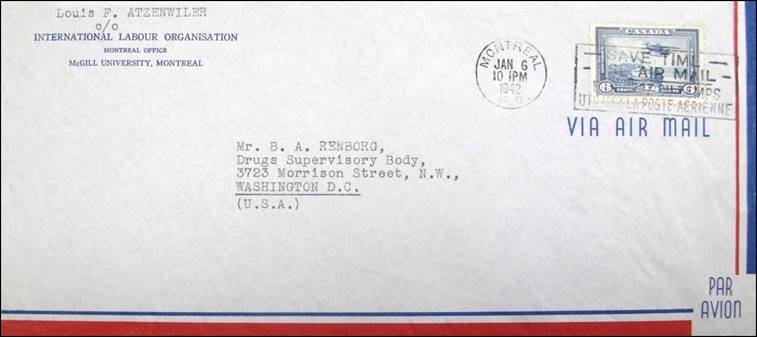 6 January 1942 – Service cover from ILO Headquarters in Montréal (at McGill University). In fact, although ILO had already moved at that time to 3480 University Street, this mail used the stationery leftover from the period when the Organization was hosted at McGill University.