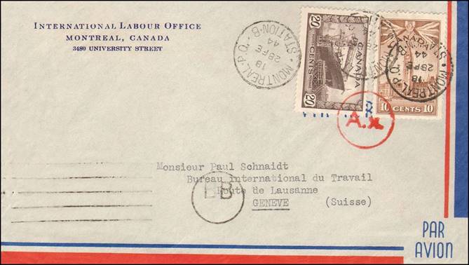 28 February 1944 – Service cover from ILO Headquarters in Montréal (at 3480 University Street) to the remaining office in Geneva.