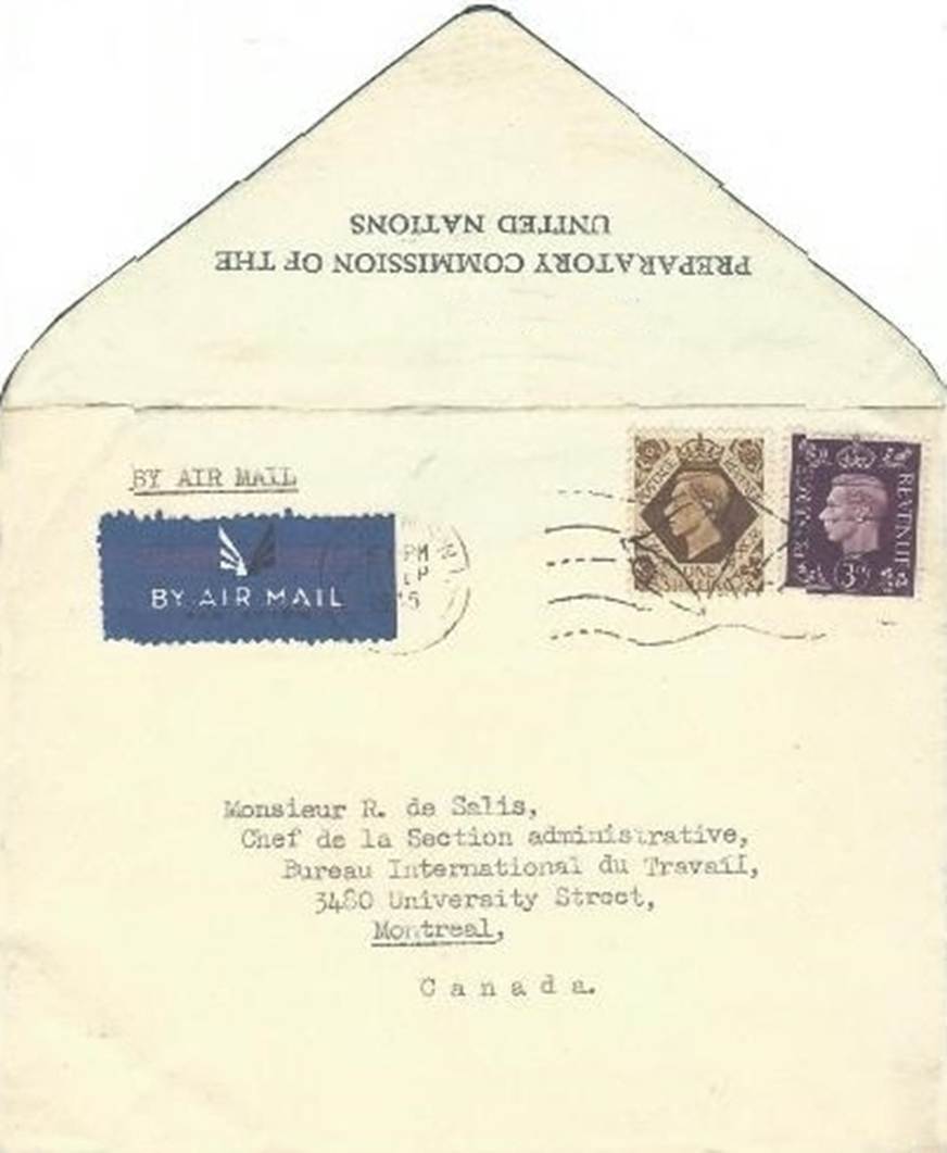 Cover sent from the UN Preparatory Commission to ILO Office in Montreal, Canada. Cancelled on 11 November 1945. The Church House in London housed the Secretariat of the United Nations Preparatory Commission (consisting of the delegates of the fifty-one United Nations, 24 Nov-23 Dec 1945), and in 1946, the temporary headquarters of the United Nations Secretariat.