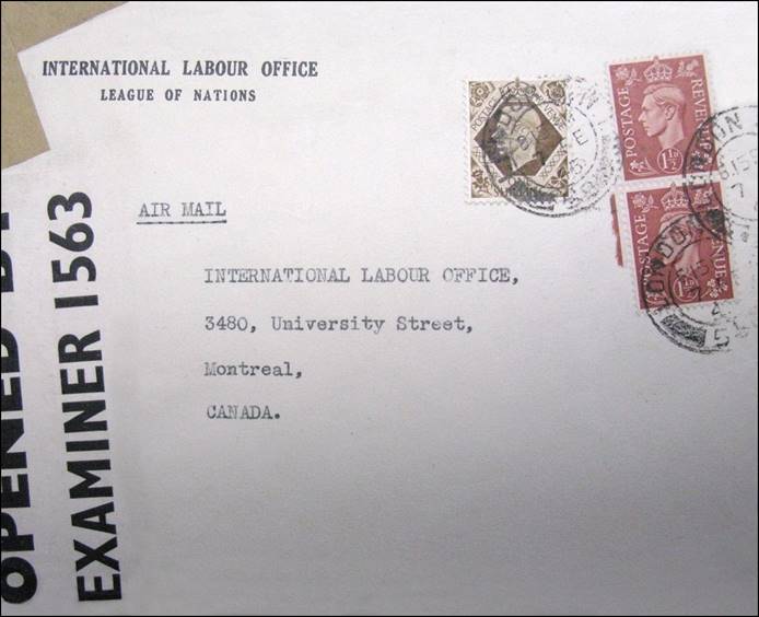 7 February 1945 – Censored cover sent from the ILO Office in London to the ILO Headquarters at 3480 University Street, Montréal. ILO was established in 1919 as part of the League of Nations.