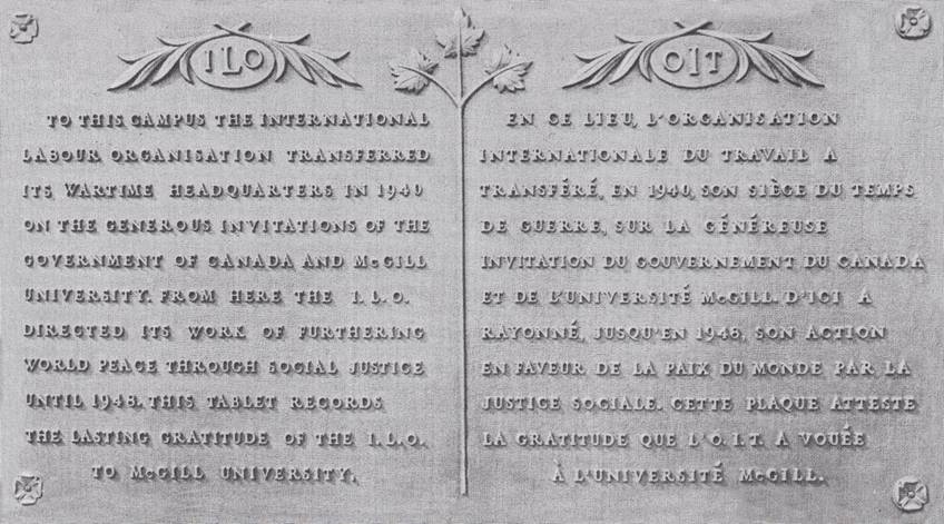 A commemorative plaque was unveiled at McGill University (in Sir William Dawson Hall) in Montréal on 14 September 1950, recording the lasting gratitude of ILO to McGill University: “To this campus the International Labour Organisation transferred its wartime headquarters in 1940 on the generous invitations of the Government of Canada and McGill University. From here the I.L.O. directed its work of furthering world peace through social justice until 1948. This tablet records the lasting gratitude of the I.L.O. to McGill University”.