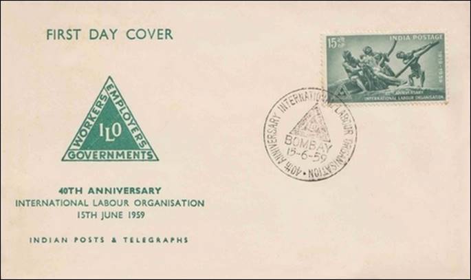 India – 15 June 1959 – 40th anniversary of ILO. The cachet makes reference to the tripartite structure of the ILO. |