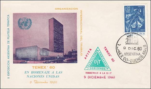 Argentina – Second Thematic Philatelic Exhibition (TEMEX ’60) held in Buenos Aires from 4 from 9 December 1960. During this exhibition, a total of 12 covers were released paying tribute to the United Nations, its Programmes and Specialized Agencies; all covers are similar except for the emblem, the colors of the UN Buildings in New York and the date of release. These covers were issued on different dates ranging from 4 to 9 December 1960; the above cover related to ILO was dated 9 December 1960.