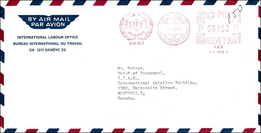 Service cover sent from the BIT (Bureau International du Travail) to ICAO. The slogan commemorates the 50th anniversary of the establishment of the BIT (1919-1969). Postmark dated 19 November 1969.