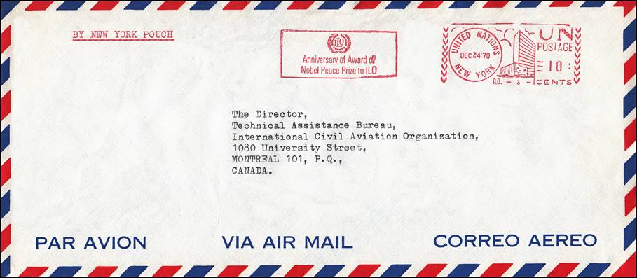 Service cover sent to ICAO from a Technical Assistance project through the UN pouch. Postmark dated 24 December 1970. Slogan showing the first anniversary of the award of the Nobel Peace Prize to ILO in 1969.