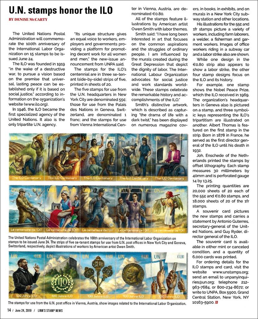 United Nations – ILO 100th anniversary stamps. Excerpt from the LINN’S Stamp News weekly journal, 24 June 2019, Vol. 92, No. 4730, Page 14. |