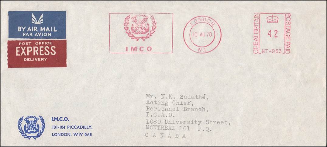 Service cover sent from IMCO in London to ICAO. Postmark dated 10 July 1970. IMO slogan.