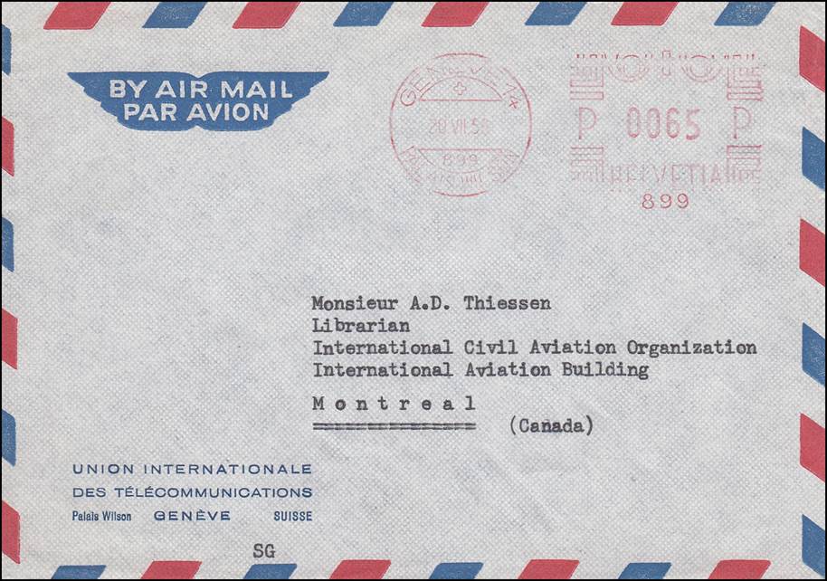 Service cover sent by ITU to ICAO Chief, Library. Postmarked on 20 July 1956. A.D. Thiessen was the first Chief, Library at ICAO. When ICAO came into being, active measures were taken to ensure that the Organization had at its disposal an aeronautical and general library appropriate to the needs of the staff and national representatives. The object had been to acquire a collection of basic reference books and current publications on subjects within the Organization’s field of interest.