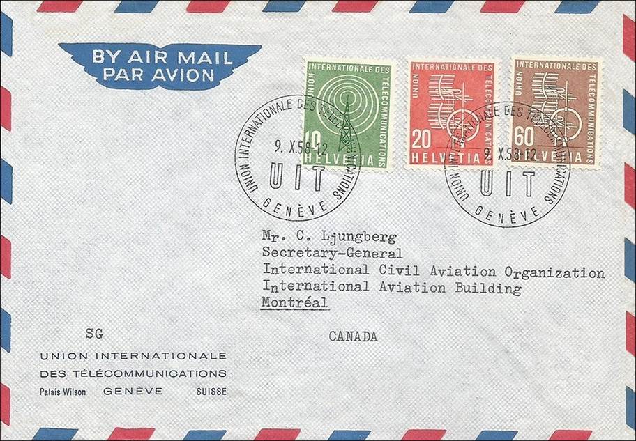 Service cover sent by ITU to ICAO Secretary General C. Ljungberg. Postmarked on 9 October 1958.