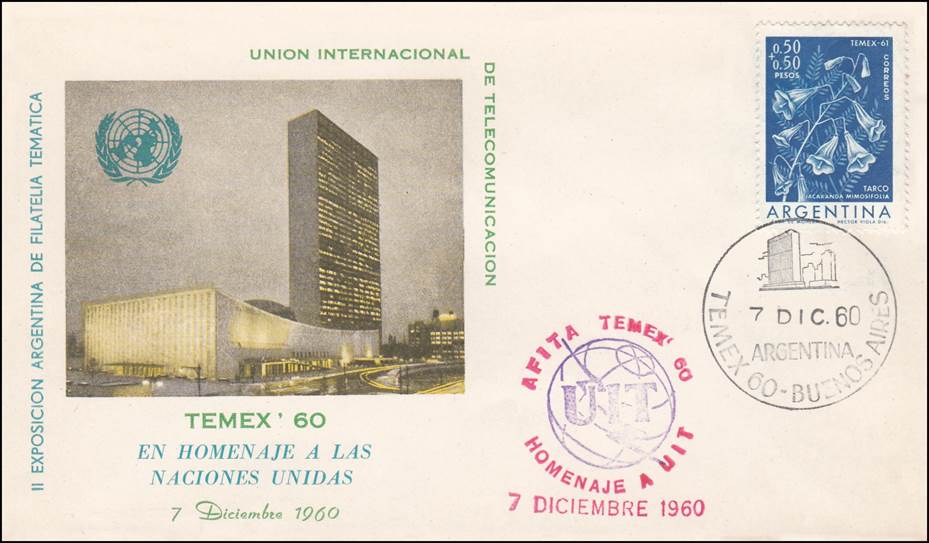 Argentina – Second Thematic Philatelic Exhibition (TEMEX ’60) held in Buenos Aires from 4 from 9 December 1960. During this exhibition, a total of 12 covers were released paying tribute to the United Nations, its Programmes and Specialized Agencies; all covers are similar, except for the emblem, the colors of the UN Buildings in New York and the date of release. These covers were issued on different dates ranging from 4 to 9 December 1960; the above cover related to ITU was dated 7 December 1960.
