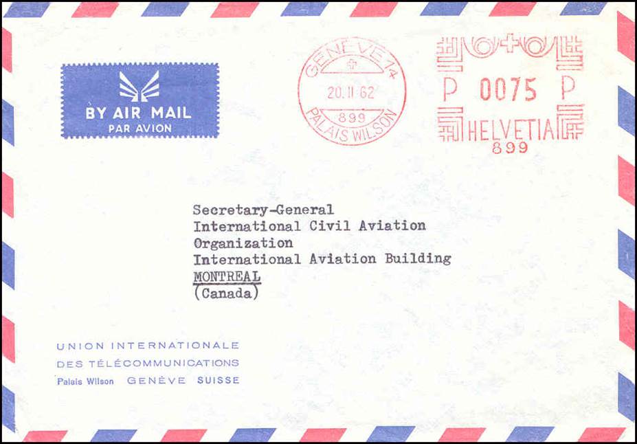 Service cover sent by ITU to ICAO Secretary General. Postmarked on 20 February 1962.