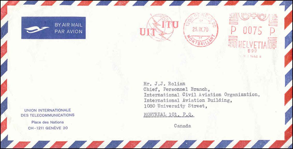 Service cover sent by ITU to ICAO Chief of Personnel Branch. Postmarked on 25 September 1970 - UIT/ITU Slogan.