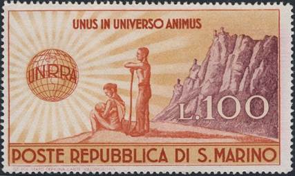 UNRRA issue – San Marino – 14 March 1946 The idiom UNUS IN UNIVERSO ANIMUS means: ONE SOUL IN THE UNIVERSE. |