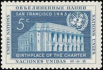 UN stamp showing the San Francisco War Memorial Opera House, where the UN Charter was signed on 26 June 1945 |