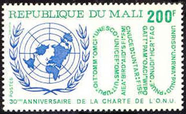 Mali – 10 November 1975 30th Anniversary of UN Charter UN emblem and names of the Specialized Agencies (including OACI, Organisation de l’aviation civile internationale, in the right branch of the letter N) forming the acronym ONU (Organisation des Nations Unies) |