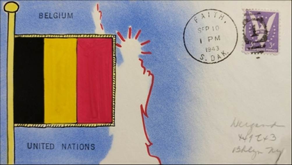Patriotic covers referring to the Allies as the “United Nations” (even before the United Nations Charter was officially signed on 26 June 1945), dated 14 January 1943, 21 March 1943, 10 September 1943, 11 October 1943, and 23 November respectively. The third cover reminds that Belgium was one of the thirteen nations overrun and occupied by the German troops during World War II; the hand-drawn cachet shows the country’s flag. The
