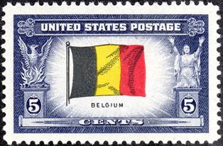 Note: The United States Post Office Department began its series of Overrun Countries stamps on 22 June 1943, with a stamp featuring Poland’s flag. The 13th and last stamp in the series, issued on 2 November, 1944, shows the Korean flag. Each of five-cent denomination pays tribute to thirteen nations overrun, occupied, and/or annexed by the Axis Powers during or shortly before World War II. The stamps depict, in full color, the national flags of those countries with the names of the respective country underneath. Released on 14 September 1943, the sixth stamp of this series shows the Belgian flag (see at left).