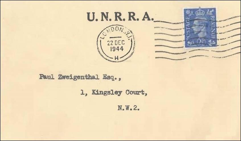 Service cover sent from UNRRA (United Nations Relief and Rehabilitation Administration Office) in London. Postmark dated 22 December 1944.