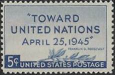 At the left: Proposed design of the US stamp for the Conference. Franklin Roosevelt, a philatelist himself, did not like this design. He requested that the design of the stamp, commemorating the United Nations Peace Conference, be as simple as possible and suggested the wording “Toward United Nations”. He also requested that the stamp have a 5¢ denomination so it could be used to send foreign first-class mail. At the right: Officially accepted design of the stamp commemorating the Conference.