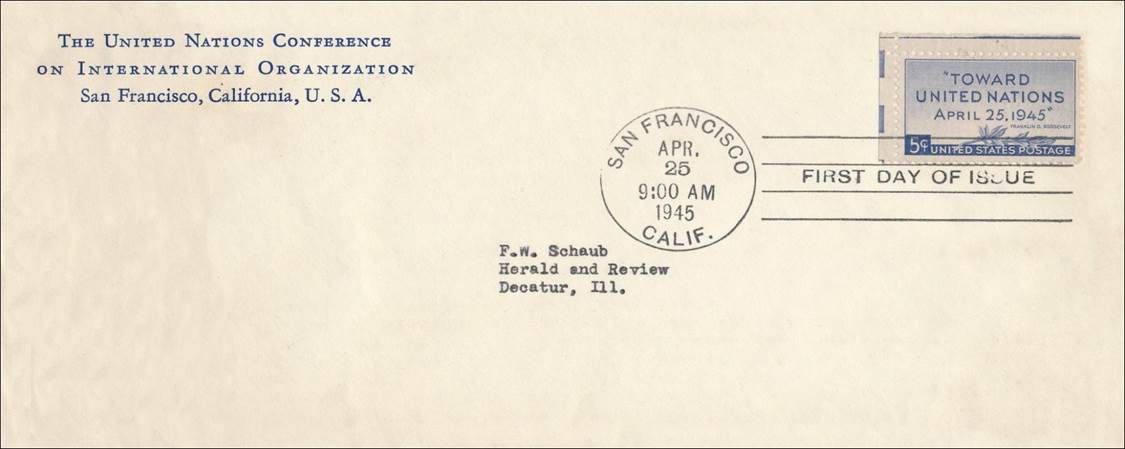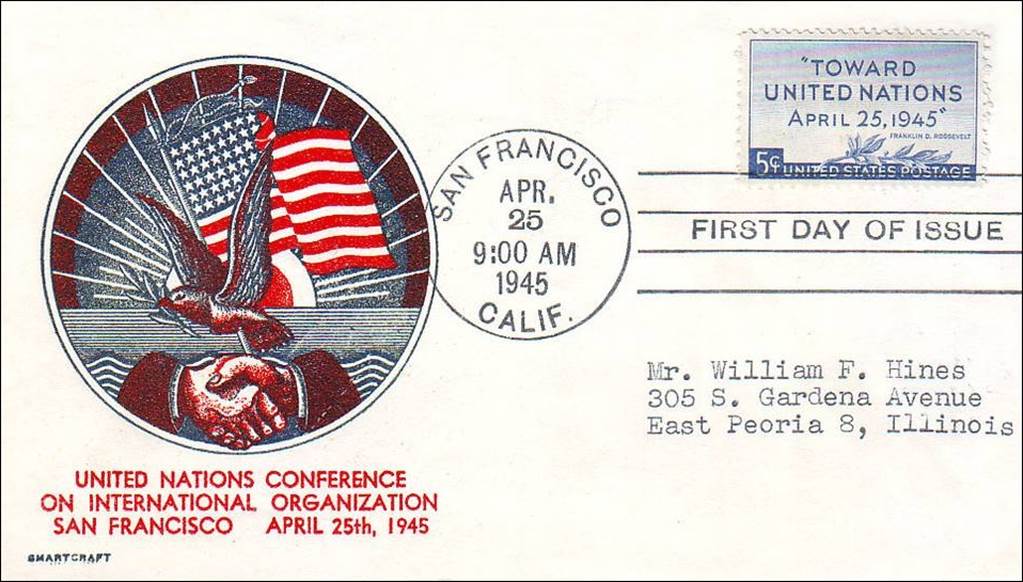 First day cover issued by Smartcraft on the opening day of the San Francisco Conference on 25 April 1945.