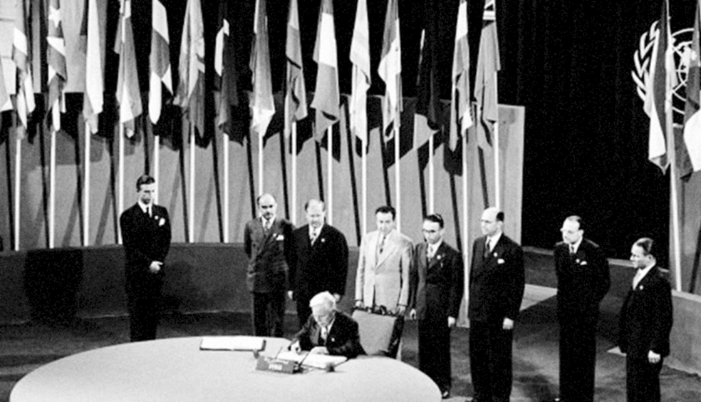The signing of the original UN Charter by a delegation on 26 June 1945 at a ceremony held at the Veterans’ War Memorial Hall in San Francisco. On 26 June 1945, the delegates filed up one by one to a huge round table on which lay the two historic volumes, the Charter and the Statute of the International Court of Justice. Behind each delegate stood the other members of the delegation against a colourful semicircle of the flags of fifty nations. In the dazzling brilliance of powerful spotlights, each delegate affixed his signature.