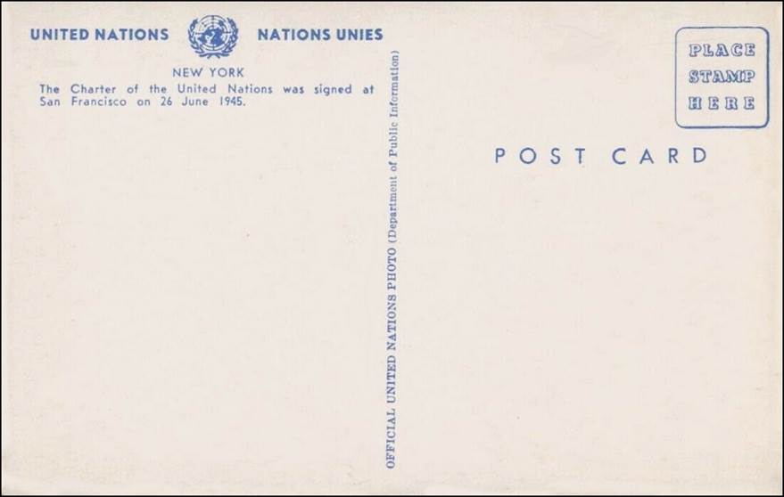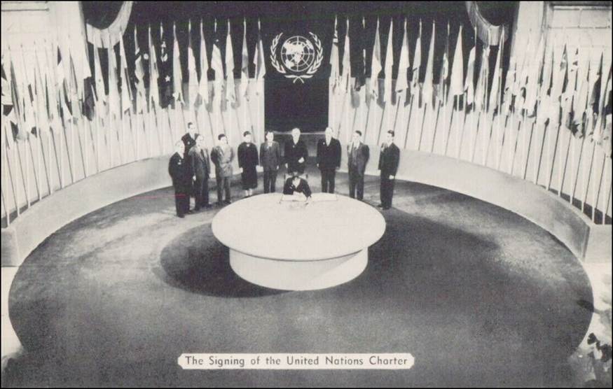 The signing of the original UN Charter by a delegation on 26 June 1945 at a ceremony held at the Veterans’ War Memorial Hall in San Francisco. Postcard, recto and verso. Note the full picture of the UN emblem in use at that time.