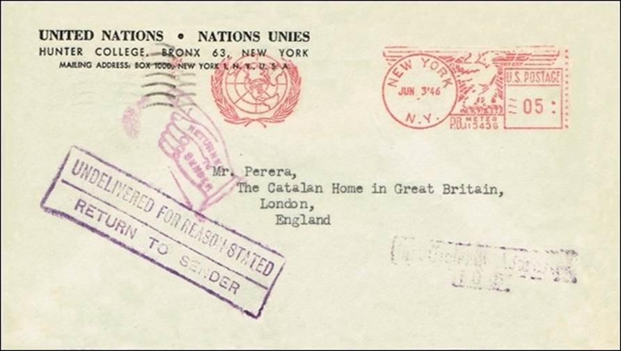 Service cover sent from the Hunter College, Bronx, New York, site of the first location of the United Nations. Postmark dated 3 June 1946. During the Second World War, the Hunter College leased the Bronx Campus buildings to the United States Navy who used the facilities to train 95,000 women volunteers for military service. When the Navy vacated the campus, the site was briefly occupied by the nascent United Nations, which held its first Security Council sessions at the Bronx Campus in 1946, giving the school an international profile.