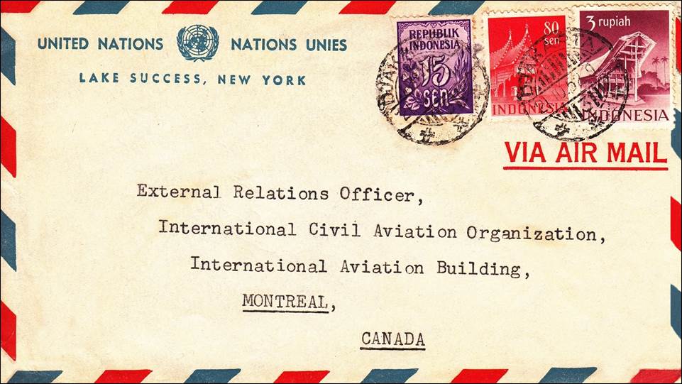 Stationery from the UN Lake Success, New York, site of the second location of the United Nations. Postmark in Indonesia dated 21 October 1952. The Incorporated Village of Lake Success was the second temporary home of the United Nations, occupying the headquarters of the Sperry Gyroscope Company on Marcus Avenue. In 1939, the United States government bought a large tract between Marcus Avenue, Lakeville Road and Union Turnpike, to be the home to the Sperry Gyroscope Company which built a variety of maritime, military, aerospace and navigation products. During World War II, the plant had 22,000 employees. After the war, part of the plant became the temporary headquarters of the United Nations from 1946 to 1952, while its headquarters building in New York City was being built.
