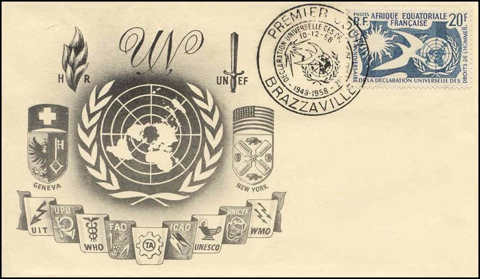 Congo - First day cover dated 10 December 1958. (Afrique Équatoriale Française or French Equatorial Africa in 1958). 10th Anniversary of UN Universal Declaration of Human Rights. Black cachet.