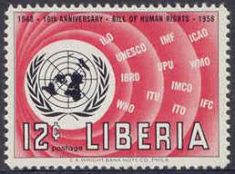 Liberia – 17 December 1958. 10th Anniversary of UN Universal Declaration of Human Rights. UN emblem and initials of UN Agencies (with ICAO’s name, in the upper-right corner).