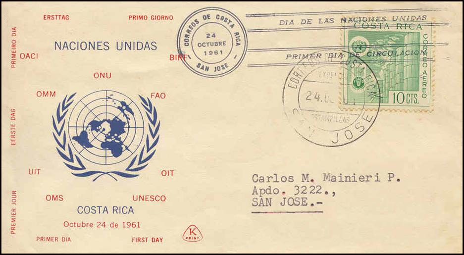 Costa Rica – 24 October 1961- United Nations Day - The UN family. Note that the acronyms in the cachet are spelled in French and that the acronym BIRF should have been written BIRD for Banque internationale pour la reconstruction et le développement (International Bank for Reconstruction and Development - IBRD).