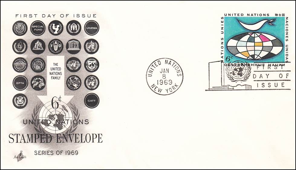 The cachet depicts the UN family and was overprinted by Art Craft after the issue of the postal stationery. As regards the ICAO emblem, note that the wings have been truncated and the top circle has been doubled.