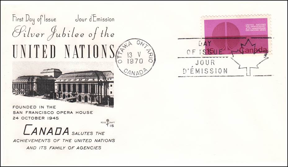 Canada – First Day Cover dated 13 May 1970. 25th Anniversary of the United Nations. The text in the Rose Craft cachet recognizes the achievements of the UN and its Agencies (among which is ICAO). To commemorate UN’s silver jubilee, Canada Post Office issued two stamps (10-cent and 15-cent) symbolically representing a sense of emergence and illustrating the tremendous force and energy being focused towards the unification of the world.