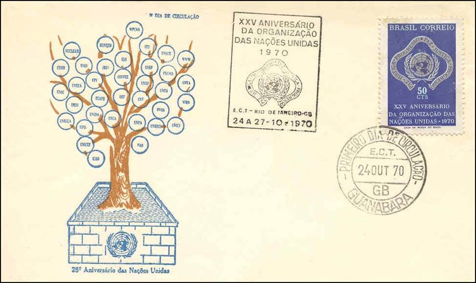 Brazil - First day cover dated 24 October 1970. 25th Anniversary of the United Nations. The UN family’s tree (with ICAO’s name, on the lower-left side) The stamp strip reads: Peace, Justice, Progress.