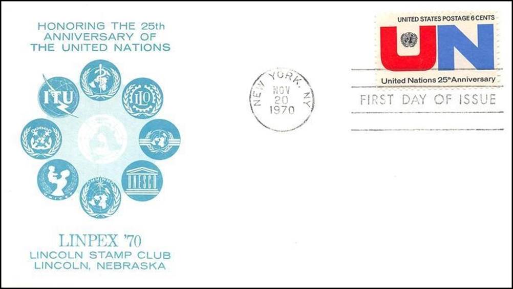 United Nations New York – 20 November 1970. On the occasion of its 1970 yearly show, the Lincoln Stamp Club, at Lincoln, Nebraska, commemorated the 25th anniversary of the United Nations by overprinting this cover with the emblems of some of the members of the UN family.The cachet depicts the UN family with the emblems of (from left to right, clockwise): IMO, ITU, WHO. ILO, ICAO (with the wings partially truncated), UNESCO, and WMO.