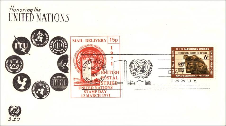 United Nations New York – 12 March 1971. Cachet by S.L.F. Franked with the UN New York stamp issued on 12 March 1971 for the International Support for Refugees and the British Postal Strike Stamp tied.The cachet depicts the UN family with the emblems of (from left to right, clockwise): IMO, ITU, WHO, ILO, ICAO (partially hidden by the stamp), UNESCO, WMO, and UNICEF. The first full national strike in the history of the British Post Office took place from Wednesday 20 January to Sunday 7 March 1971. It took place against a background of increasing inflation and worsening industrial relations over the preceding decade, both in the Post Office and in the country in general. On 15 January a pay offer from the Post Office Board was rejected by the executive of the Union of Post Office Workers. An "all-out" strike was called to start at midnight on 19/20 January. Although local mail deliveries were possible in some areas, either where the postmen did not go on strike or as some gradually returned to work, the bulk of the country's postal services came to a complete halt. Fortunately for mailers and collectors alike, the government announced the suspension of the monopoly on carrying mail, instantaneously giving rise to several hundred private posts throughout the country. Many were purely philatelic in nature, created only to sell labels to collectors.