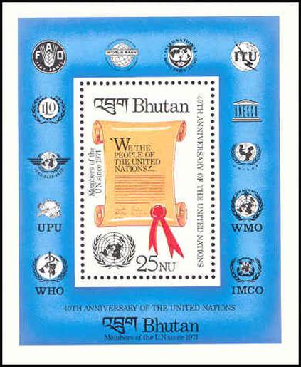 Bhutan - 24 October 1985. 40th Anniversary of the United Nations. Preamble to the UN Charter. The miniature sheet has bright blue margins picturing the emblems of the UN agencies.