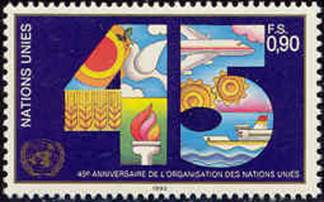 United Nations – 26 June 1990. 45th Anniversary of the signing of the UN Charter in San Francisco on 26 June 1945. Pictures identifying the major areas of attention of the United Nations, its Agencies and Programs, forming the number “45”. As regards ICAO’s relationship, an airplane is shown in the upper side of digit 5. The activity of the UN Organizations is depicted as follows: UN (several programmes are illustrated - security: yellow circle surrounded by a red crown; peace: dove holding an olive branch in its beak; human rights: flaming torch); FAO (wheat); ICAO (aircraft); UNDP, Technical Assistance to Least Developed Countries (LDCs), ILO, and UN Economic and Social Council - ECOSOC (two cogwheels as vital gear in a machine); IMO (ship); UNEP (clean environment) and WMO (sky and clouds).