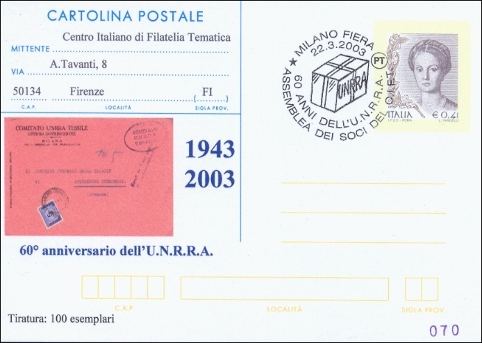 Postal card commemorating the 60th anniversary of UNRRA (United Nations Relief and Rehabilitation Administration Office) in 2003. |