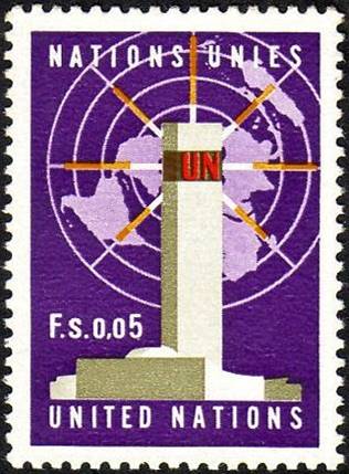 Geneva – 4 October 1969 The first stamp of a set of 8 stamps issued on that day. UN Headquarters in New York; UN emblem.