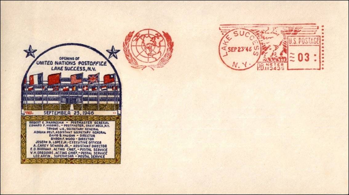Prior to October 1951, the UN used the facilities of the United States Post Office Department. On 20 August 1946, the US Post Office opened an office in Great Neck, responsible for the first UN offices in Lake Success. On 23 September 1946, the Dater Circle was changed in Lake Success (NY) branch. The United Nations Philately began at that time.