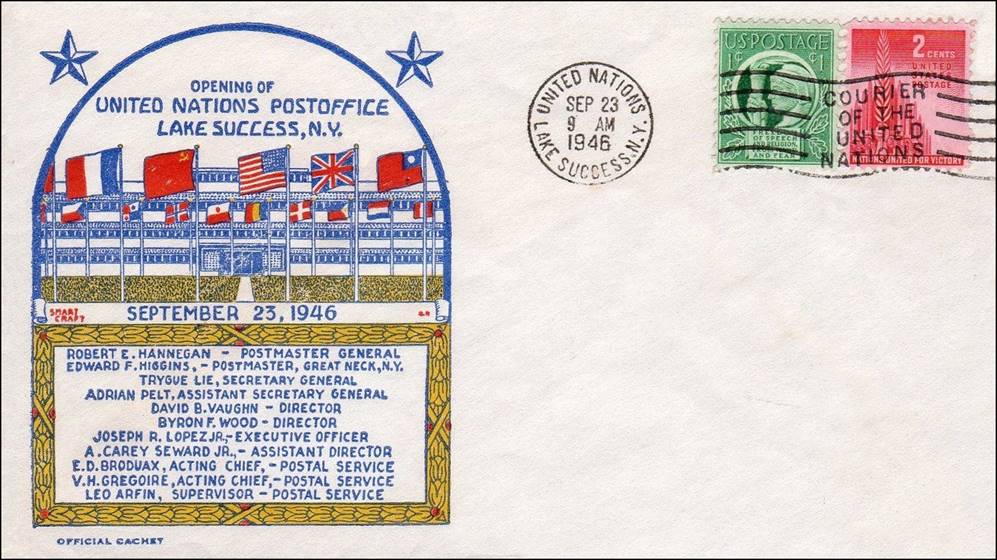 23 September 1946 - Lake Success UN Post Office Opening. Thermographed covers.Smart Craft Official cachets.When the United Nations moved in August 1946 to a building that during World War II had been a Sperry Gyroscope Co. plant located at Lake Success, New York, postal service was provided by the Great Neck Post Office. On 23 September 1946, the Lake Success branch of the Great Neck Post Office (known as the “UN Post Office”) opened; it provided a full range of postal services.