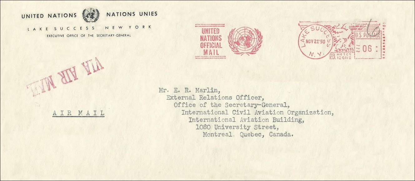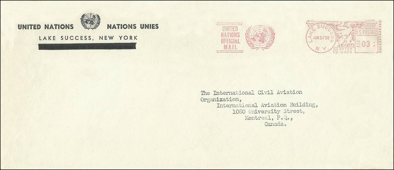 Covers sent from UN New York to ICAO. Lake Success UN Post Office metered stamps. |