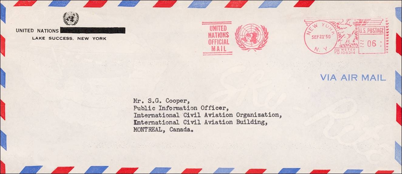 Cover sent from UN New York to ICAO’s President of the Council. Postmark dated 8 January 1951. |