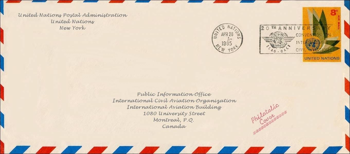 Postal Stationery - Air Postal Envelope sent from the UNPA in New York to ICAO.Postmark dated 28 April 1965. Slogan commemorating the 20th anniversary of ICAO. |