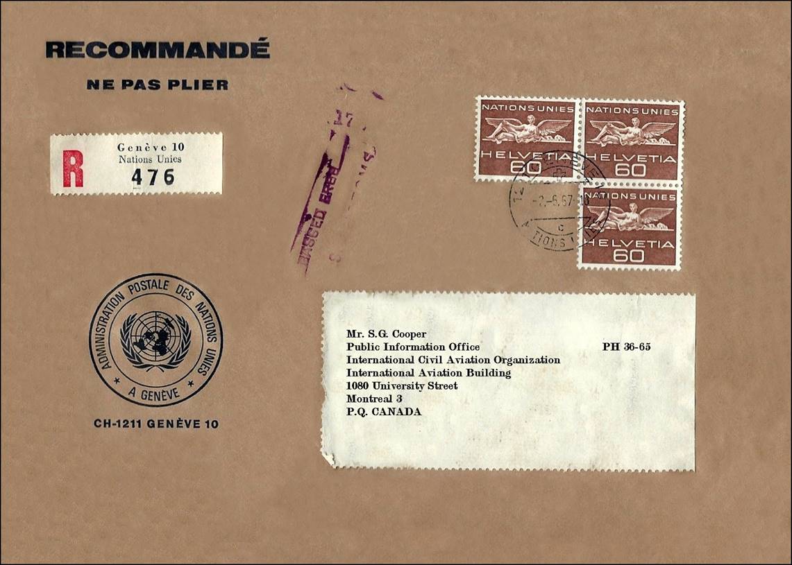 Cover sent from UNPA Geneva to ICAO Public Information Office. Postmarked on 2 June 1967. |