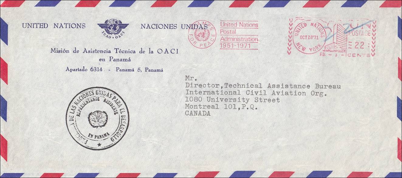 Service cover sent (through the pouch) from the UNDP Project in Panama to the Director of the Technical Assistance Bureau at ICAO. Slogan: STAMPS FOR PEACE, commemorating the 50th anniversary of the UN postal service. Postmark dated 28 October 1971. |