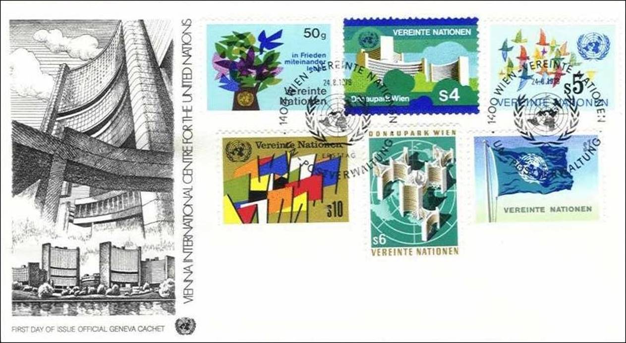 Similar postal agreements were reached with the Swiss and Austrian postal authorities. On 11 December 1968, an agreement between the United Nations and the Swiss Postal Telephone and Telegraph Enterprise enabled the Geneva office of the UNPA to issue the first UN stamps in Swiss francs on 4 October 1969. An agreement with the Austrian government on 28 June 1979 enabled the Vienna Office of UNPA to issue the first UN stamps in Austrian schillings on 24 August 1979; on that date, the UN issued a set of 6 stamps to commemorate the opening of the International Center in Vienna.