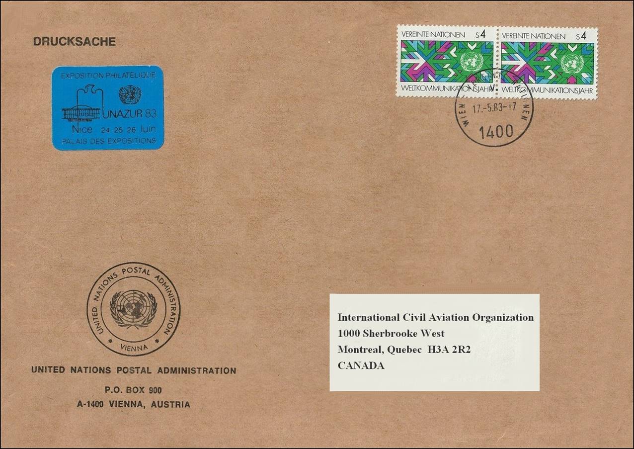 Cover sent from UNPA Vienna to ICAO. Postmarked on 17 May 1983.Blue label of the UNAZUR International Philatelic Exhibition held in Nice, France from 24 to 26 June 1983.